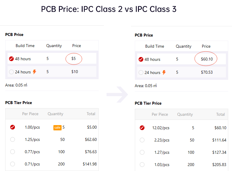 Impact of IPC Class Level on PCB Cost for 100x100mm, 5pcs