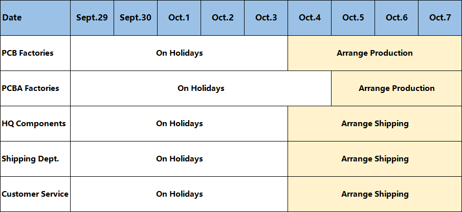 In order to better give back to our employees and ensure that everyone can fully enjoy the holidays, taking into account company's current situation, NextPCB factories will have holidays from September 29th to October 3rd. During this time, orders can still be placed online, the delivery date will be postponed accordingly.
