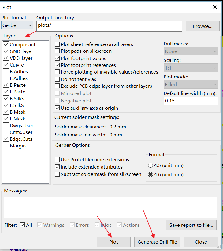 Select the layers and set an output directory for the Gerber files. Then click "Plot" to export the Gerber file for the layers.