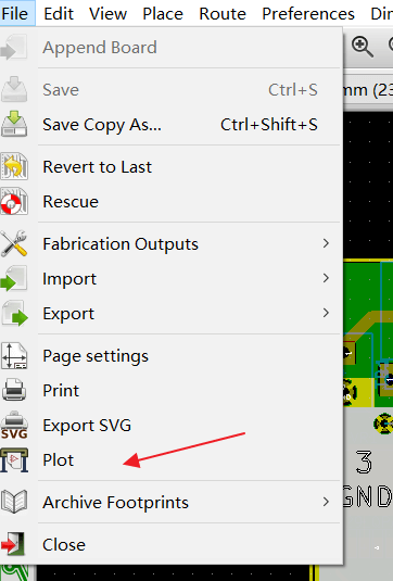 Please find the PCB design file in KiCad and select "Plot" under the "Files" to open the Gerber generation tool.