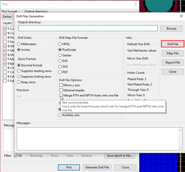 Ensure the Plot format is set to "Gerber." Next, please click the "Generate Drill File" button, and use the default values as the following picture. The output folder should be the default, which is the same as the Gerber files. Then click "Drill File" after everything is OK.