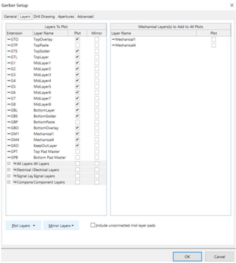 Firstly, please make sure you have a clear outline in the mechanical layer. If your board is a 2-layer PCB, there will be no inner layers (G1, G2, G3....). Include the layers that you want to export by marking these, select "Used On" in Plot Layers, and Select "All Off" in Mirror Layers.