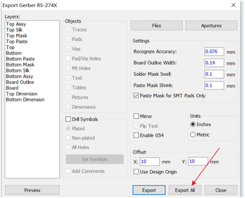 See the below picture, when you make sure all configurations are fine. Please click the "OK" to generate the Gerber files. Gerber Files will be automatically exported from the Altium cam viewer.