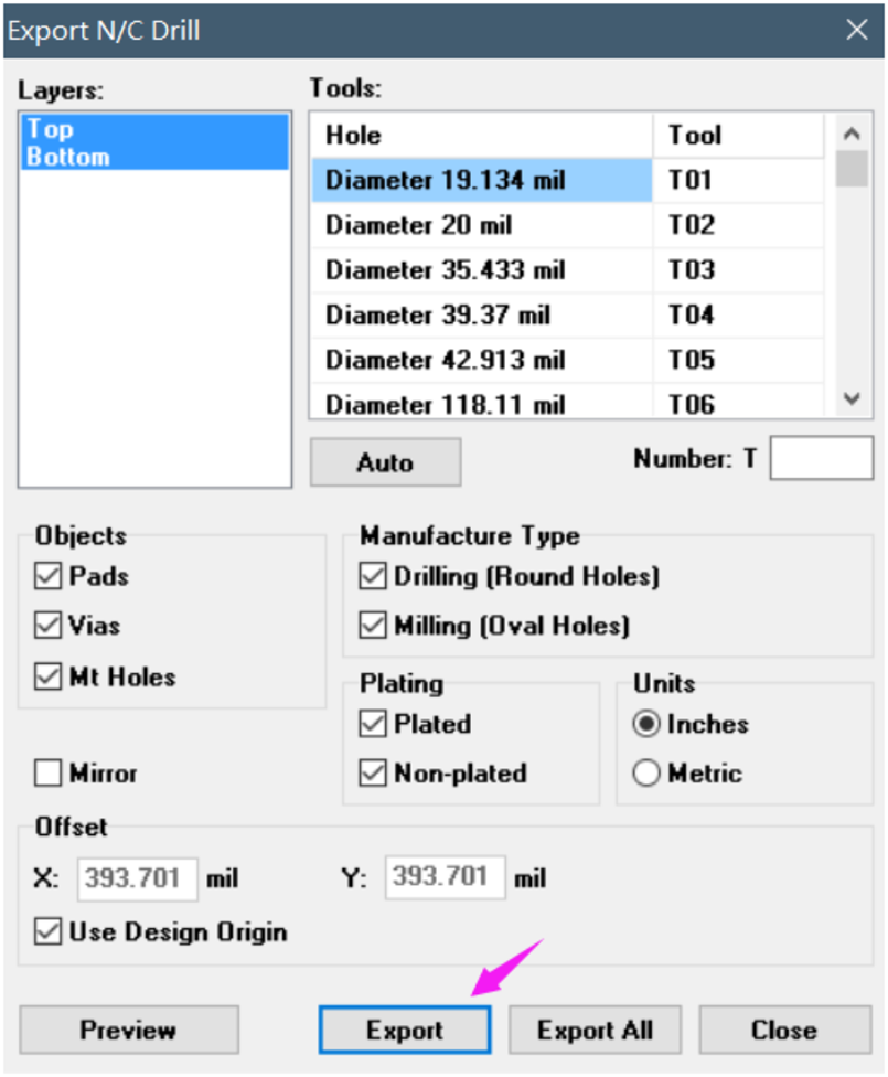 Don't forget to export the NC Drill data after generating the Gerber file. Many engineers will forget this step so that the supplier could not fabricate the PCBs without a drill data file.