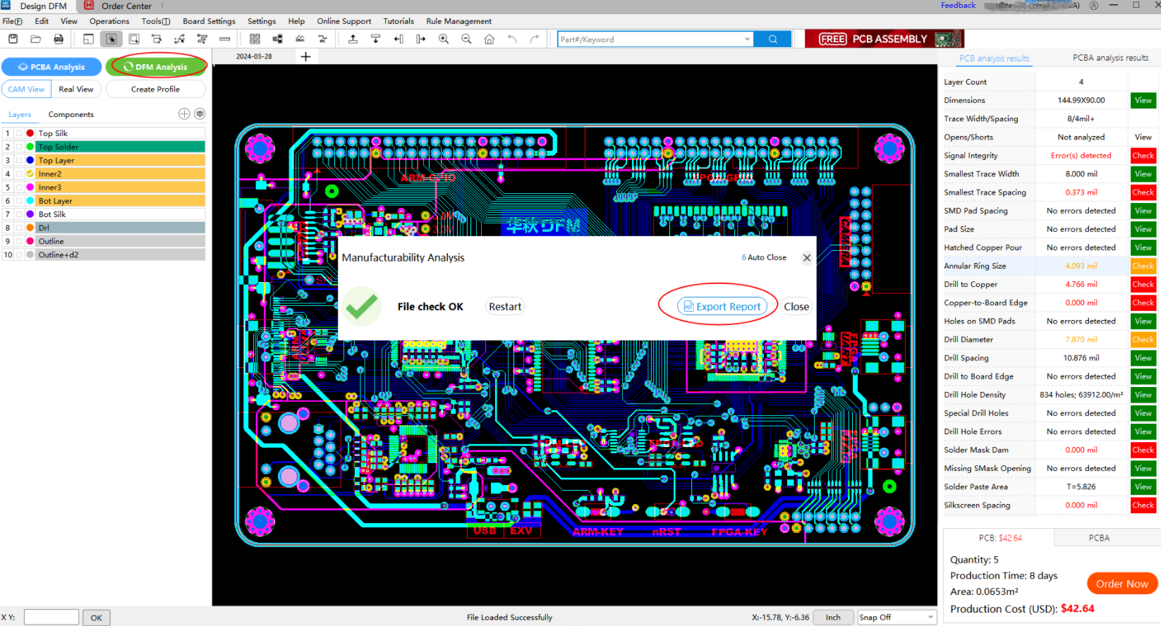 There is a comprehensive software solution that not only enables DFM and PCBA analysis but also There is a comprehensive software solution that not only enables DFM and PCBA analysis but also generates detailed DFM reports, offering the capability to export Gerber files as PDF.