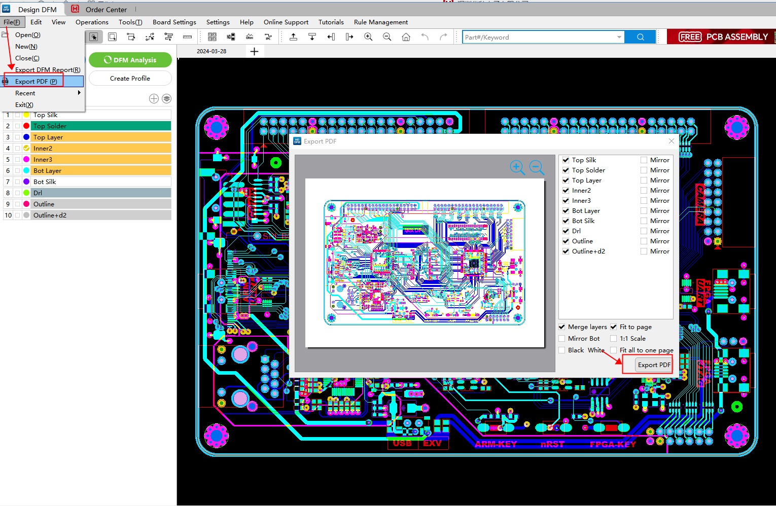 After uploading the Gerber file to the HQDFM software, click “File” in the upper left corner, and then select “Export PDF” to export gerber file to PDF.