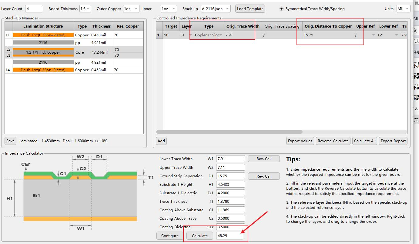 As shown, we input the customer’s data under stack-up 2116 and click "calculate," resulting in an impedance of 48.29 Ohms, which is slightly below the required 50 Ohms. Since the customer requires stack-up 2116 and the impedance model of Coplanar Single-ended to remain unchanged, we can only adjust the trace width of 7.91 mil and the distance to copper of 15.75 mil.