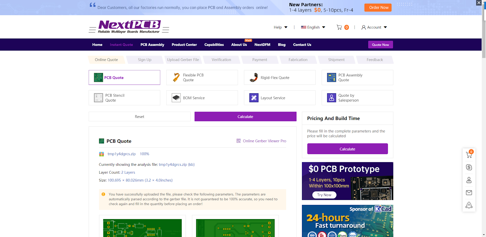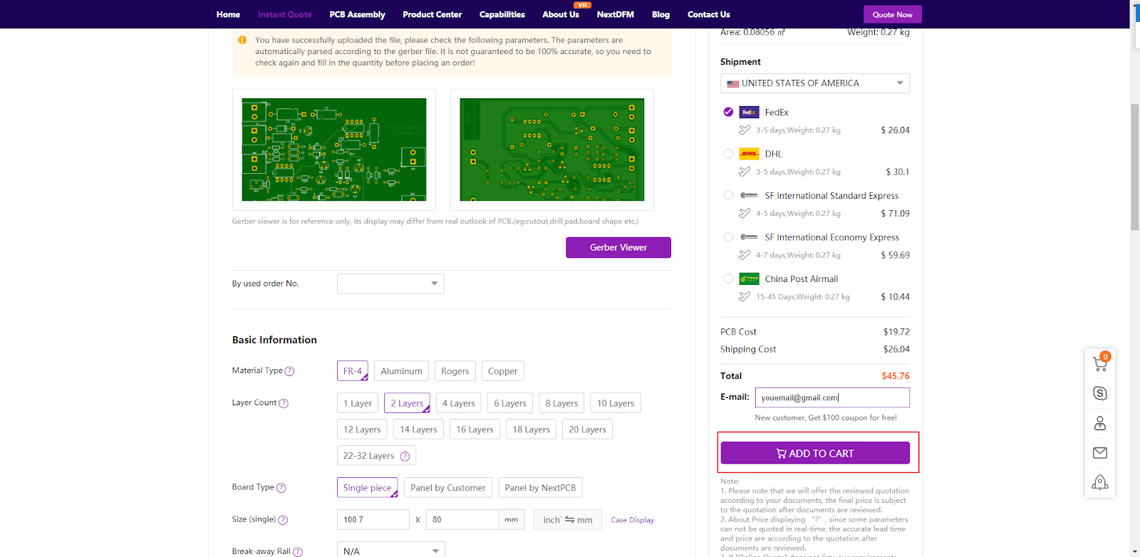 Click the Add to Cart button and the plugin will export your Gerber and NC drill files in a format compatible with NextPCB and upload them onto the NextPCB order platform. The extracted order parameters will also be filled in for you for seamless ordering.