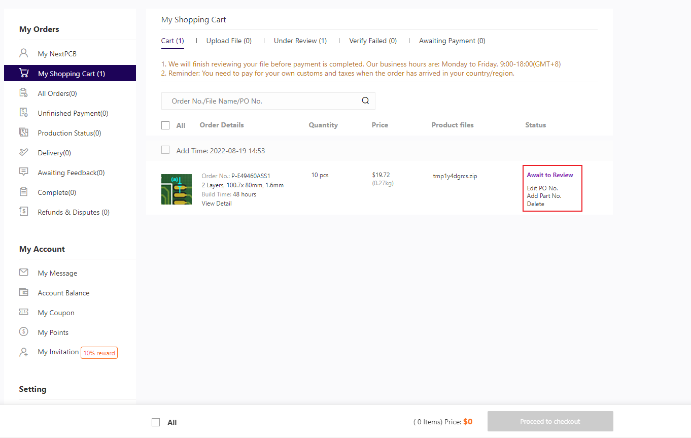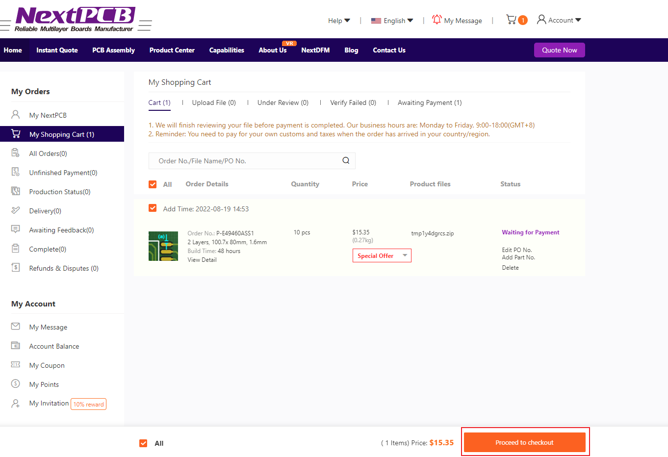 Once you’ve completed the design, the Add to Cart function will export the Gerber and assembly data for you and upload them straight onto the NextPCB platform, where you can proceed with the order of your PCBs - no more fiddling with Gerber export configurations or worrying about compatibility issues.