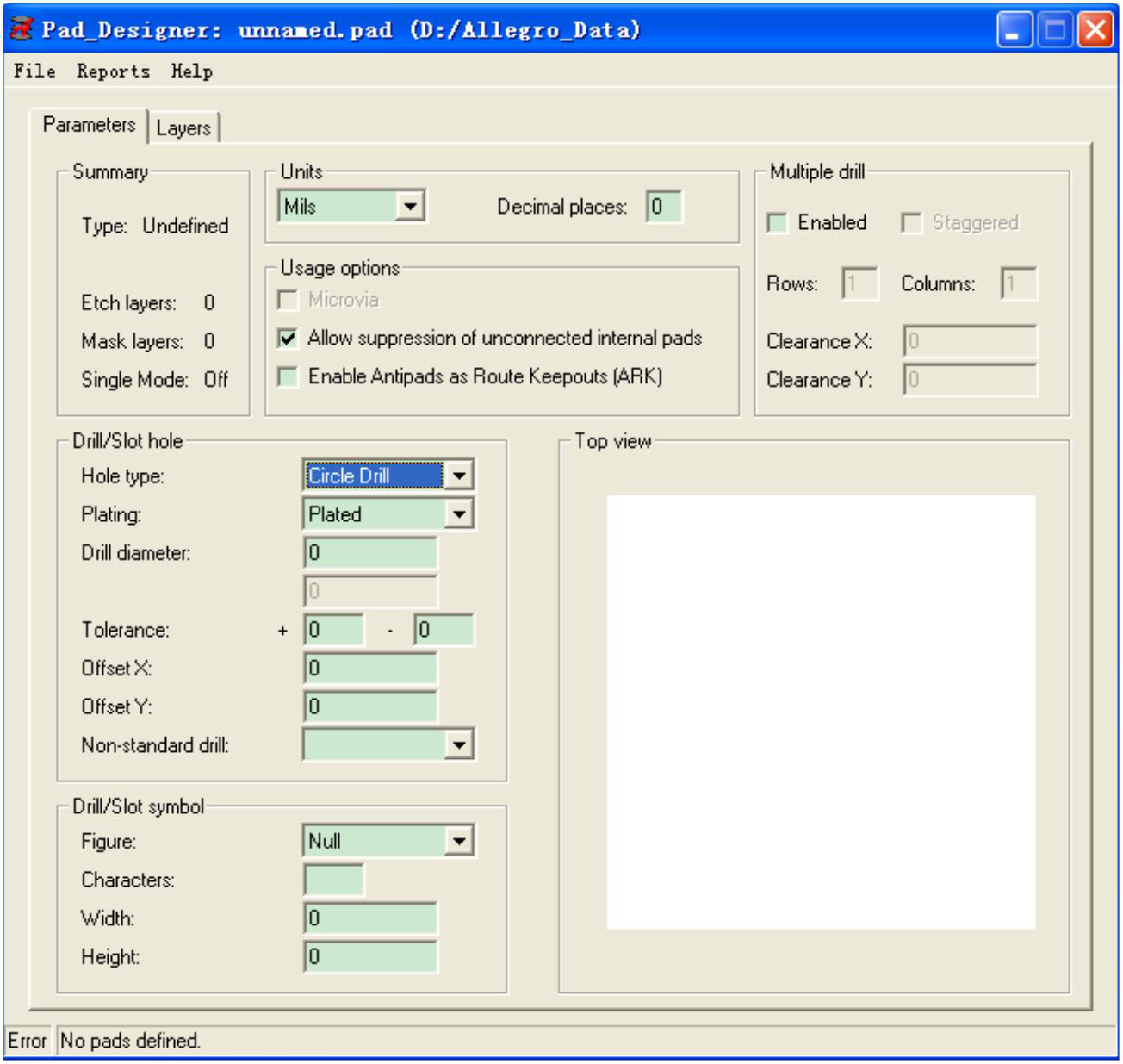 Enter the drill diameter in the Drill diameter edit box. If you choose an ellipse or a rectangular hole, the two parameters Slot size X and Slot size Y correspond to the X and Y-axis radius of the ellipse and the length and width of the rectangle respectively. In general, it is enough to set the above parameters, and other parameters can be set by default. After setting, click the Layers tab to enter the interface as shown in Figure 1.2.