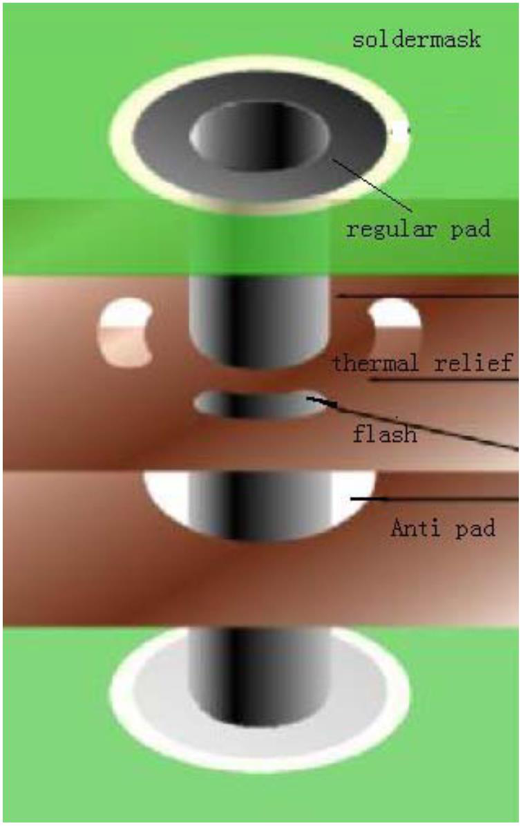 Thermal Relief: Hot air pad, also called a flower pad, is effective in the negative film. It is used to connect the pad and copper in the negative film.
