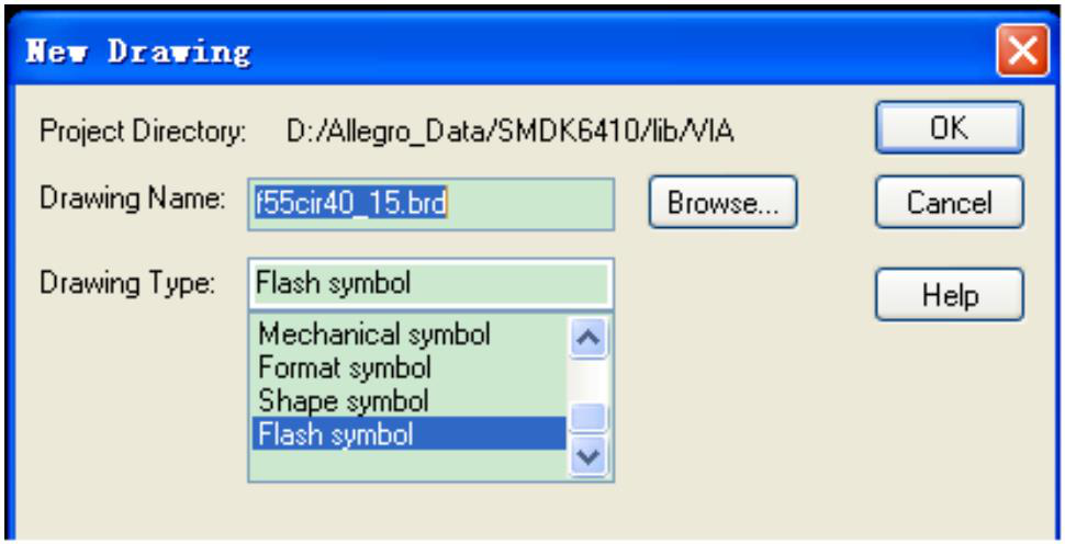Enter the file name f55cir40_15 in the Drawing Name edit box, the suffix name is automatically generated. Select Flash symbol in the DrawingType list box, and click OK.