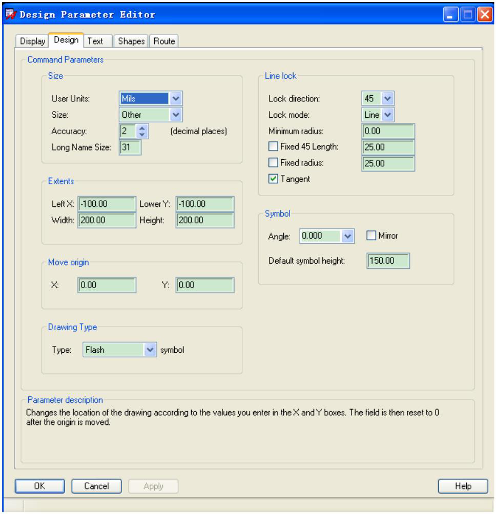 Select the unit Mils in User Units. In Accuracy, set the number of decimal places. The default is two digits. Enter 200 for Width and 200 for Height to set the size of the drawing area. You can adjust the size appropriately according to the pad you made, then enter -100 for Left X and -100 for Lower Y to set the coordinates of the lower-left corner of the drawing area, So that the origin coordinate (0, 0) is at the center of the drawing area, otherwise there will be errors. Use the default values for other parameters, and then click OK to exit.