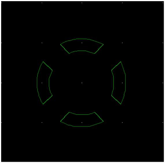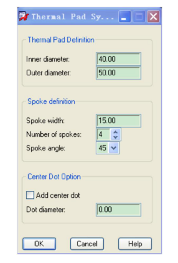 Enter the inner diameter 40 in the Inner diameter edit box, enter the outer diameter 50 in the Outer diameter edit box, and enter the connection width 15 in the Spoke width edit box. It is best not to be less than the minimum line width of the board. Select the number of openings in the Number of spokes, the default is 4, and the Spoke angel input opening angle is the default 45 degrees. Other defaults, after clicking OK, a flower pad shape will be automatically generated, as shown in Figure 1.10.