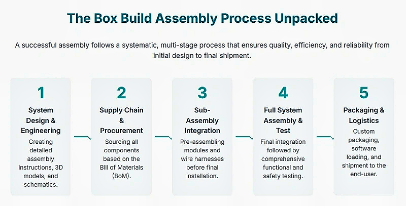 To understand how a design is transformed into a deployable product, one must detail the five key stages of the box build assembly process. The core document running throughout the entire process is the Bill of Materials (BoM), which is considered the "DNA" of the product, providing information and guidance for every phase of the project. A good, accurate BoM is the central tool for quality control, cost calculation, and cross-team communication.