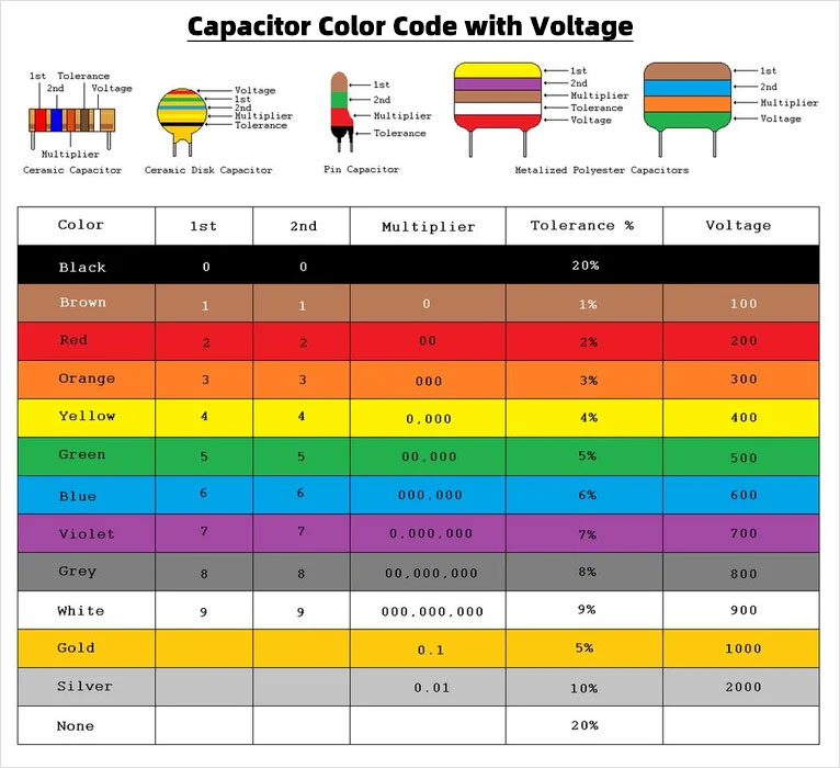 Color coding: Some capacitors have colored bands or stripes that indicate the polarity. The first band or stripe represents the first digit of the capacitance value, and the second band or stripe represents the second digit. The third band or stripe represents the multiplier, and the fourth band or stripe represents tolerance. On polarized capacitors, the fourth band or stripe can represent the polarity.