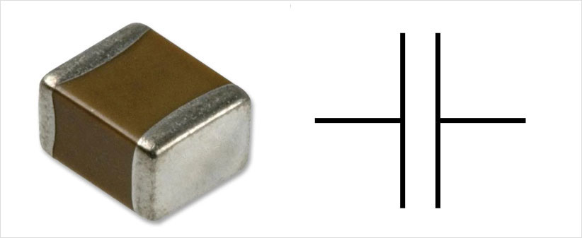 Circuit diagrams show capacitor plates as two parallel lines with a space between them. This symbol indicates a capacitor in a circuit and its approximate placement. This symbol does not indicate the capacitor type, value, or orientation.
