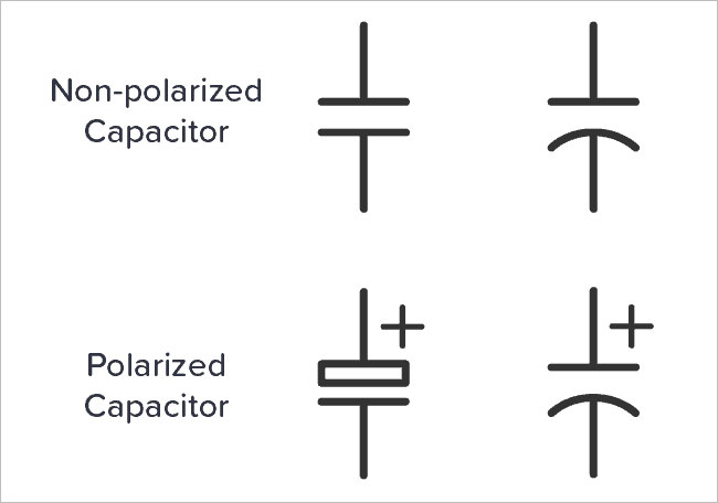 The symbol of polarized capacitors contains positive and negative leads and must be linked in the circuit correctly to work. These polarized capacitor symbols in circuit diagrams show their polarity and design.