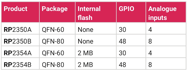 RP2350 series' four packaging variants with differences. Source: Raspberry Pi