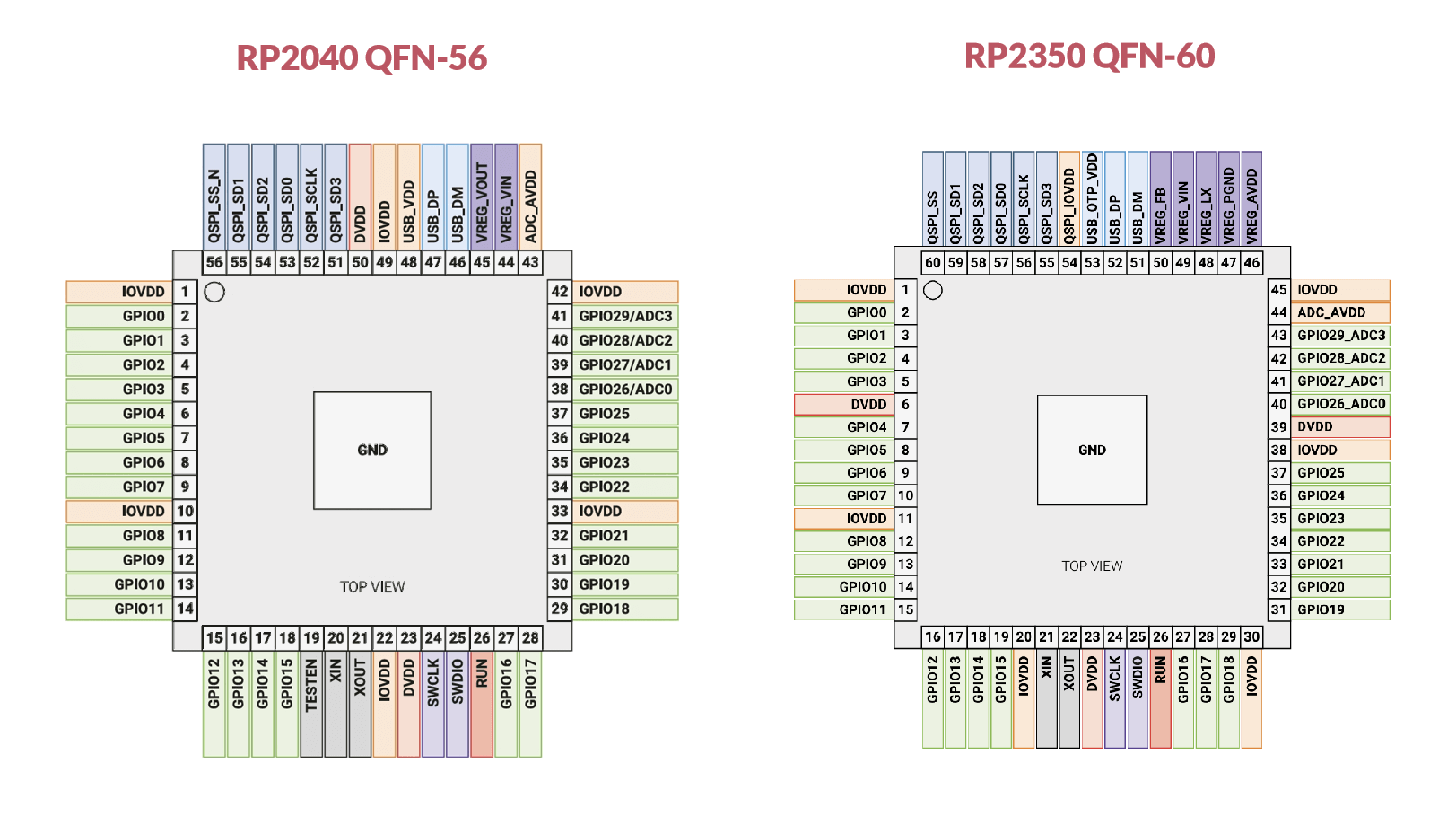 The A variants have a QFN package with the same body size as the RP2040 chip. While they have the same number of GPIOs and dimensions, note that the original RP2040 chip comes in a QFN-56 package as opposed to RP235xA's QFN-60 package. Therefore, the RP235xA are not a drop-in replacement for RP2040. RP2350 has an extra pin on each of the four sides of the package for the additional features.