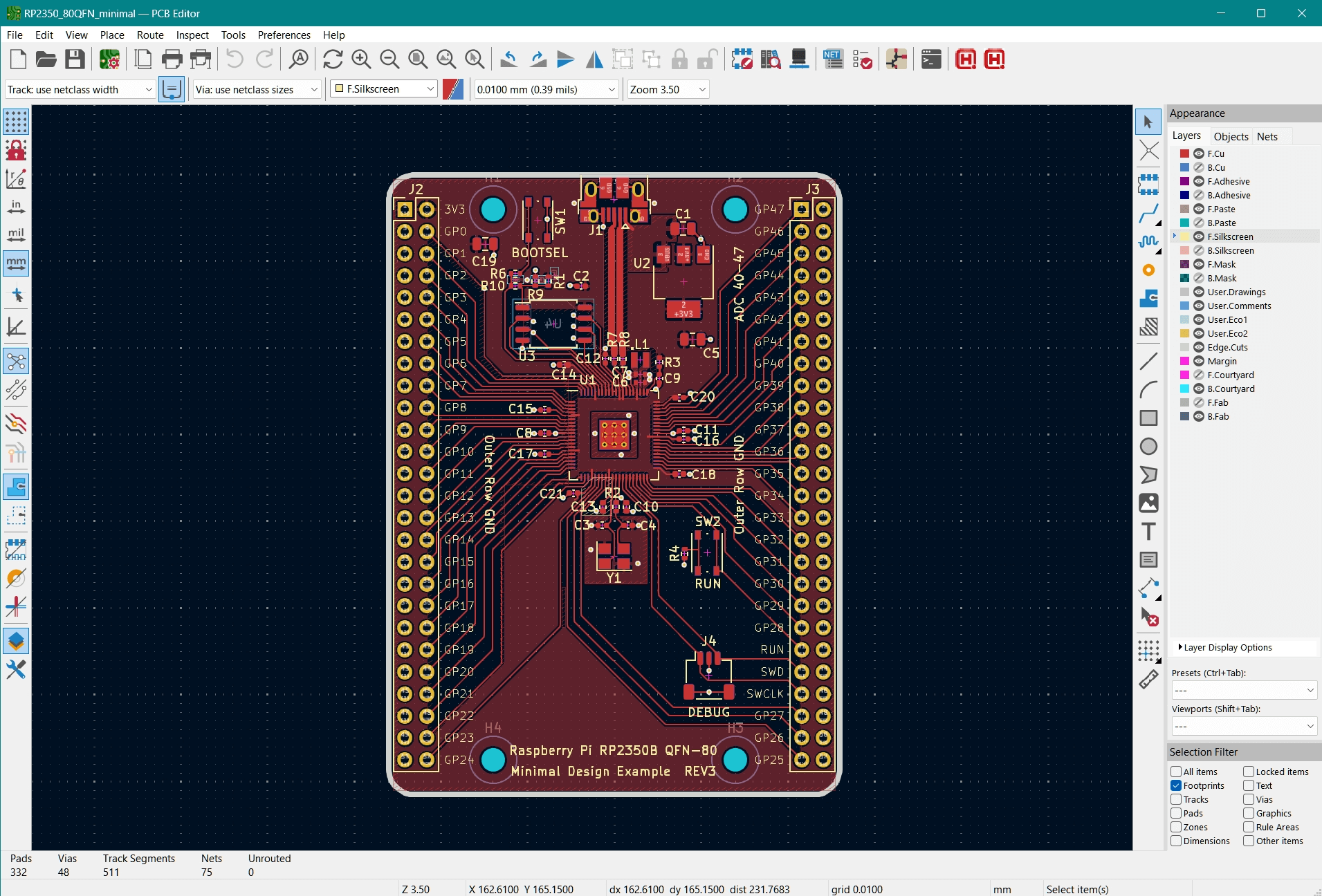 The free and open-source EDA software suite, KiCad, like Raspberry Pi, has no shortage of fans and a thriving community consisting of both hobbyists and professional s. The open, community-driven approach means that as RP2350 becomes more widely available, you can expect an abundance of early open-source design resources created using KiCad. These references will be invaluable as you develop your own RP2350-based projects.