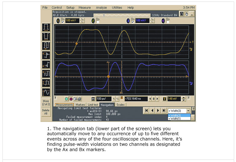 3. Event Navigation: Once a user captures a long waveform through deep storage, the next step is extremely tedious and error-prone manual work, playing back the waveforms, examining each segment of the waveform, and identifying potential signal integrity issues. Deep acquisition storage technology can capture information on 10,000 screens. It is impractical to manually review all of this information. It is unrealistic and time consuming to transfer these oscilloscope data to a controller and write custom software to analyze the data. Once the event recognition software recognizes all occurrences of the target event, it can switch back and forth between multiple occurrences of this event using the same intuitive playback control button as the DVD player. Figure 1 shows a test example using an Agilent DSO81304B oscilloscope.