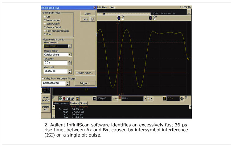 5. Speed of discerning events: The speed of the hardware trigger circuit is primarily affected by the speed of its transistors, and it uses analog techniques. Now the highest-end hardware trigger circuit can achieve pulse width (or pulse interference) triggers as low as 300ps, and 3.25Gbps serial triggering. Although these indicators are excellent, the speed of the hardware trigger circuit still can't keep up with the speed of 8.5Gbps or higher of today's top systems. Event recognition software is limited only by the oscilloscope's sampling rate, which is essentially digital. Industry-leading oscilloscopes have sample rates up to 40 GSps, and event recognition systems are faster than hardware triggers by software event recognition systems. The new technology can observe events with a pulse width of 70 ps and its sequence search speed can reach 8.5 Gbps (see another high-speed signal test example shown in Figure 2).