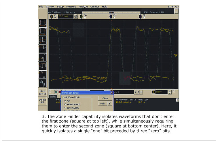 7. Visible to isolate: The most attractive aspect of event recognition software is its Zone Finder feature. Many oscilloscope users will see occasional intermittent flashes on the screen, but they won't have time to press the stop button to lock them. Usually in this case, the user will set the oscilloscope to single acquisition mode, and then press the single trigger button (sometimes need to press very many times) to effectively capture an event. In most cases, the result will only make your fingers sore. The area detector allows the user to draw an area on the screen. The user can observe the intermittent signal flashing in this area. When the waveform of this signal flashes this area next time, the oscilloscope will automatically stop and display the waveform clearly. . Figure 3 shows an example with two regions. This feature is usually very useful.