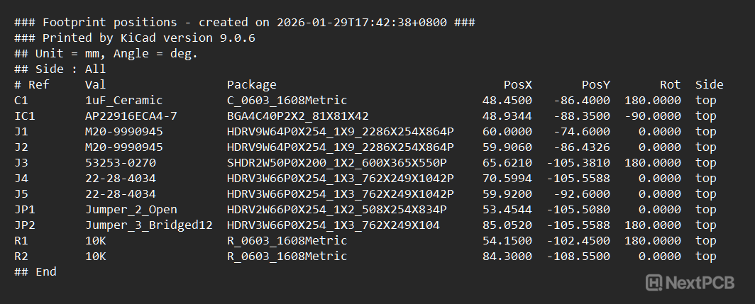 support@nextpcb.comTime to send your design off for manufacture, but the engineers are asking for a pick and place file? In this guide, we cover what a pick and place (centroid) file is, how to export it from KiCad, and what the configuration options mean. Whether you are preparing files for JLCPCB, PCBWay, NextPCB or your own assembly setup, this guide tells you everything you need to know.