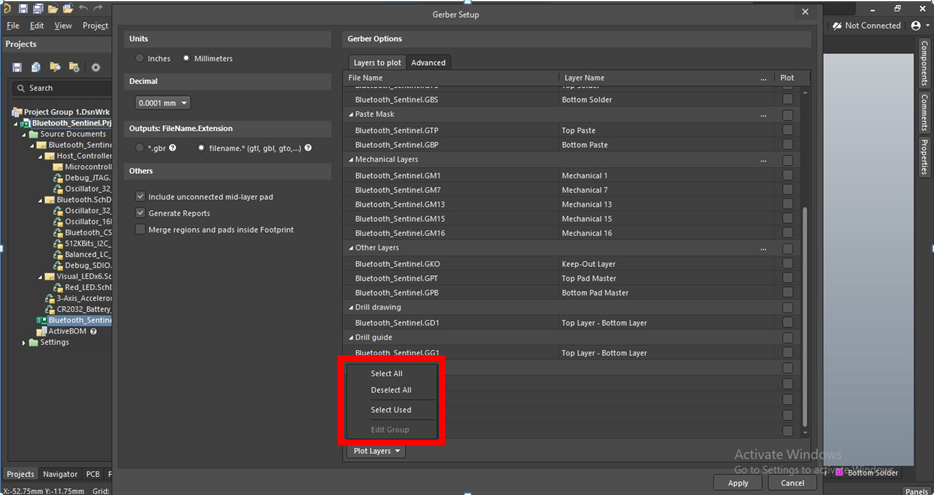 Step #4: Now it's time to select the layers to export. On the right side of the window, you can select the individual layers to export manually. However, at the bottom, there is an option to select only the layers used in the design. Do this by going to Plot Layers -> Select Used.