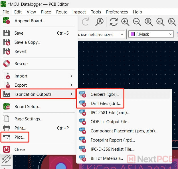 Step #1: Start by opening the PCB layout file (.kicad_pcb). Then go to File -> Plot or click the plot icon from the main toolbar. You can also go to Fabrication Outputs -> Gerbers (.gbr)...
