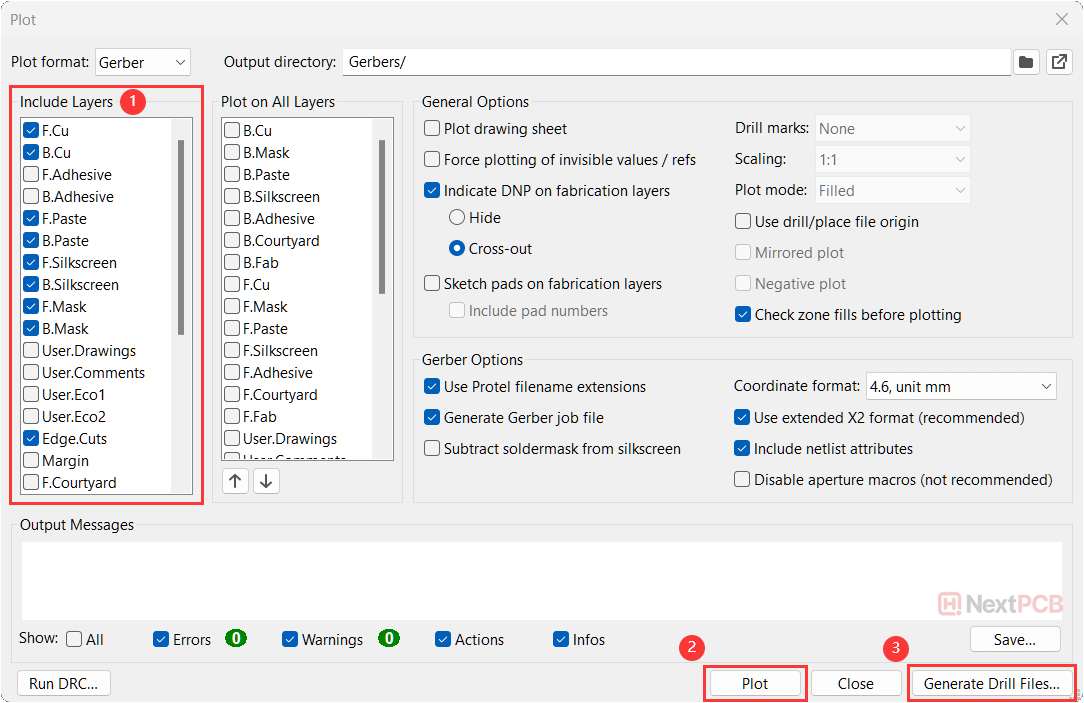 In comparison, the Gerber export process in KiCad is much simpler. Just select the desired Gerber layers and generate the drill file.