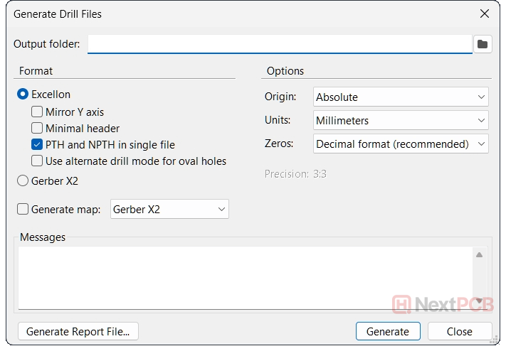 Now we have generated the Gerber files, we also need to generate the Drill Files that define the location and sizes of through holes, vias and other holes on the board. Since many drill machines typically accept NC (numerical control) data, the drill file is not actually a Gerber file and must be exported in a separate step.