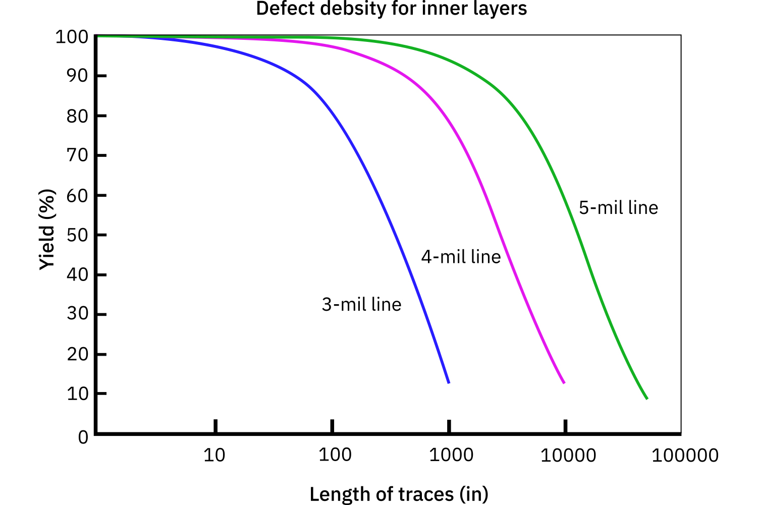 Any actual increase in the conductor density Id in PWBs would only be accessible if production with yields was possible using the designing techniques. As seen in the image below, The yields of thin conductors reduce rapidly as PWB widths drop below 5 mils.