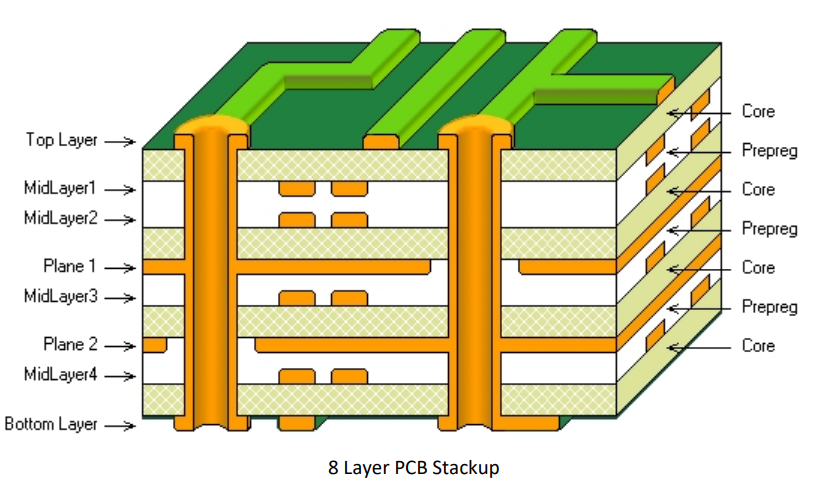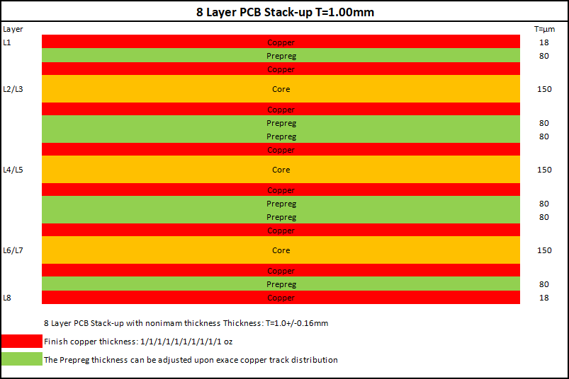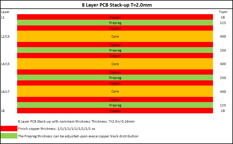 An 8-layer PCB stack-up has 8 conductive (copper) layers separated by 3 layers of core and 4-6 layers of prepregs. The arrangement of these layers in a different manner and with diversified thicknesses of material is given below: