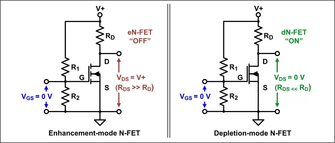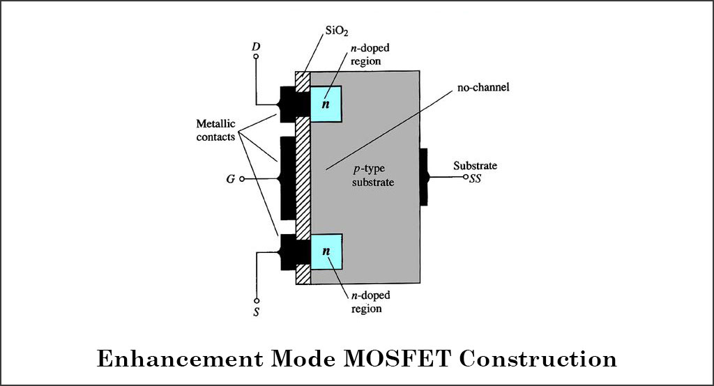 These MOSFETs have a normally-off channel between the source and drain, which is possible to turn on by applying a positive voltage to the gate. Enhancement-mode MOSFETs are widely applicable in power electronics and digital circuits.