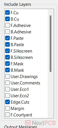 Include Layers: This section allows you to select the KiCad layers to export as Gerber files. Not all of these are necessary for production and the layer names in the screenshot may differ to your design and KiCad version, but generally the following layers are needed for a double-sided design:
