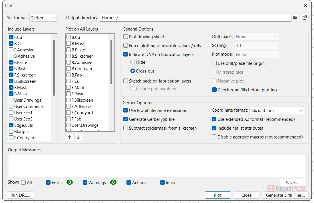 Plot Format: The default is Gerber format, but KiCad supports plotting to many other formats including SVG, Postscript, DXF, even PDF for outlines and importing into other software. For production, we will need the Gerber files.