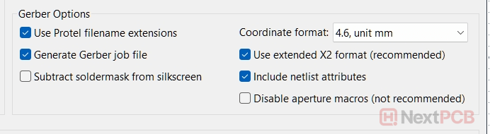 Use extended X2 format (recommended): Check this feature to add X2 header information to the Gerber files, effectively changing the Gerber format from RS-274X to X2. It is recommended, however be aware that some older manufacturers do not accept X2 format.