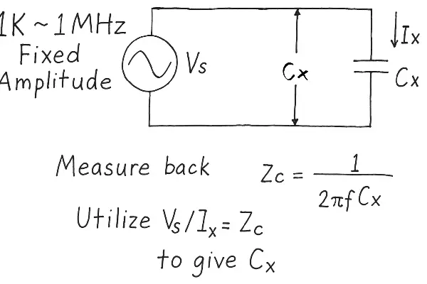AC Constant-Voltage Method: Ideal for small caps. Applies constant-amplitude sine wave at varying frequencies (f), measures resulting current (I). Calculates C ≈ I/(2πfV). Loss tangent (tanδ) can be estimated via multi-frequency measurement.
