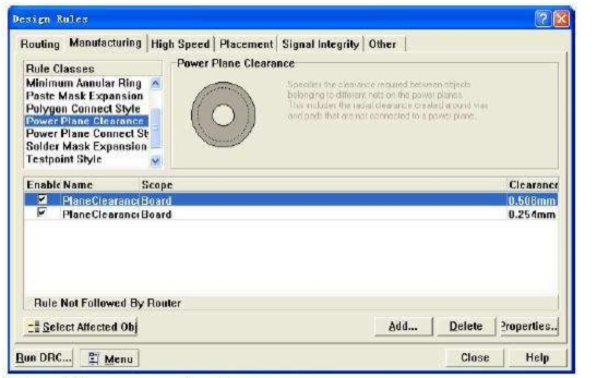 The inner electric layer is usually a whole piece of the copper film, and the pad with the same network name as the copper film will automatically connect it to the copper film when it passes through the inner electric layer. The connection form of the pad/via and the internal electrical layer, as well as the collection of copper film and other pads that are not part of the network, and the safety clearance for common progress can be set in the Power Plane Clearance option. Select the [Design]/[Rules...] command and click the Manufacturing option. The Power Plane Clearance and Power Plane Connect Style options are related to the internal electrical layer. The contents are introduced as follows.