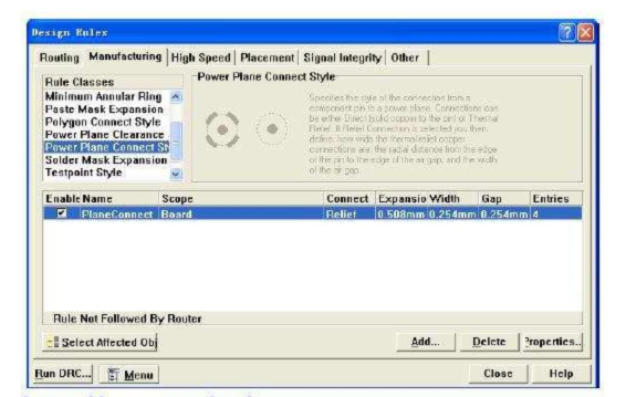 Click the Properties button to pop up its rule-setting dialog box, as shown in Figure 3. The left side of the dialog box is the scope of application of the rule. In the Rule Attributes drop-down list on the right, you can select the connection method: Relief Connect,