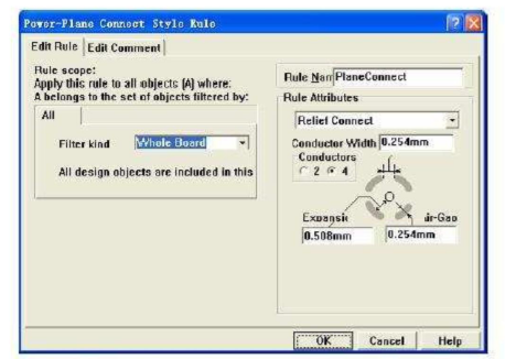 Direct Connect and No connect. Direct Connect means direct connection, the pad does not corrode the surrounding copper film when passing through the inner electric layer, and the pad is directly connected to the copper film of the inner electric layer; No connect means no connection, that is, the welding with the same name as the copper film network The disk will not be connected to the internal electrical layer; designers generally use the system’s default Relief Connect connection form, the setting dialog box of this rule is shown in Figure 3.