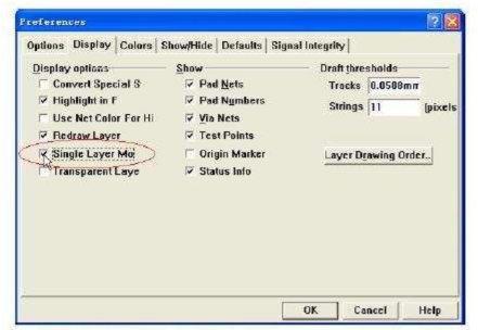 (3) Click the OK button in the electrical layer segmentation setting dialog box in Figure 5 to enter the network area border drawing state. When drawing the inner electrical layer frame, the user generally hides the information of other layers and only displays the currently edited inner electrical layer to facilitate the drawing of the frame. Select the [Tools]/[Preferences...] command, and the dialog box shown in Figure 6 pops up. Select the Display option, and then select the Single Layer Mode check box, as shown in Figure 6. In this way, except for the current working layer Power, the other layers are hidden, and the display effect is shown in Figure 7.