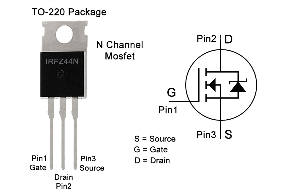 The IRFZ44N MOSFET is designed with three pins. They can be used to connect it to other components in an electronic circuit. These three pins are known as the output pins.
