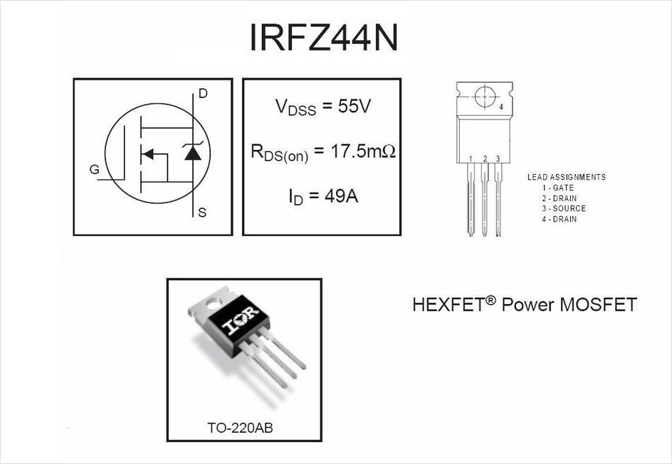On-Resistance (Rds(on)): This is the resistance between the drain and source pins when the IRFZ44N is fully turned on. The typical value of Rds(on) for IRFZ44N is 17 milliohms.