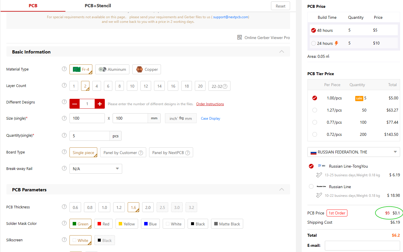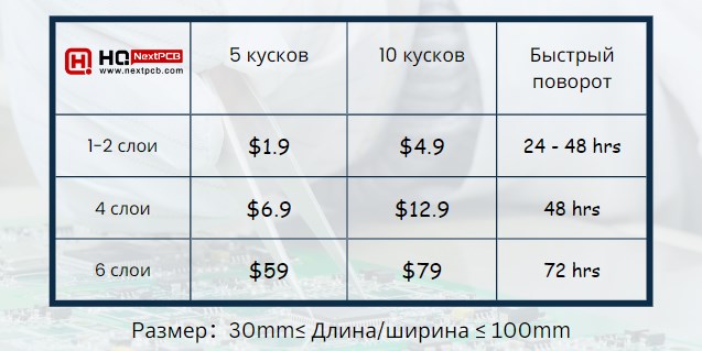 1. для новых пользователей: Пользователи в России и соседних странах могут получить скидку до $10 при первом заказе печатных плат на NextPCB. Цены на платы начинаются от $0,1 за 10 штук.