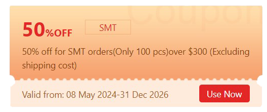 Для 100 штук: Когда стоимость SMT превышает 300 долларов, предоставляется скидка 50% на стоимость SMT