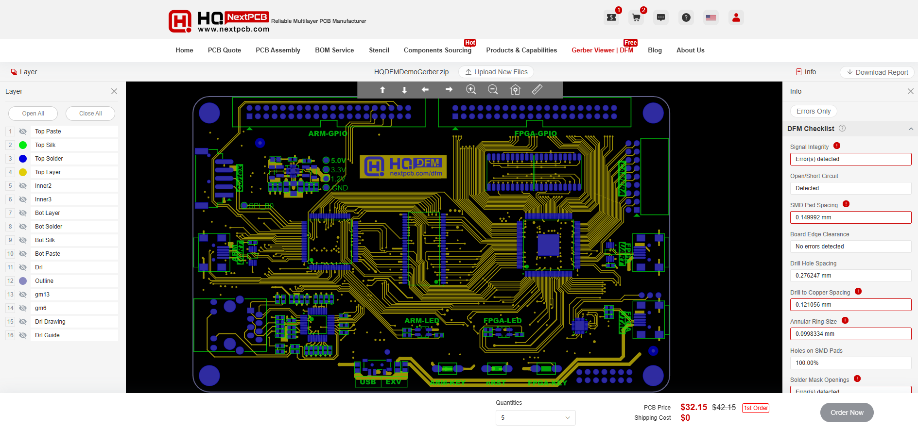 Программное обеспечение HQDFM для системы Windows обладает более мощными возможностями, автоматически анализирует потенциальные проблемы в дизайне, устраняет сложности производства, дефекты дизайна и предупреждает о факторах, влияющих на цену. Этот инструмент позволяет устранить проблему, когда онлайн Gerber Viewer не может открыть файлы.