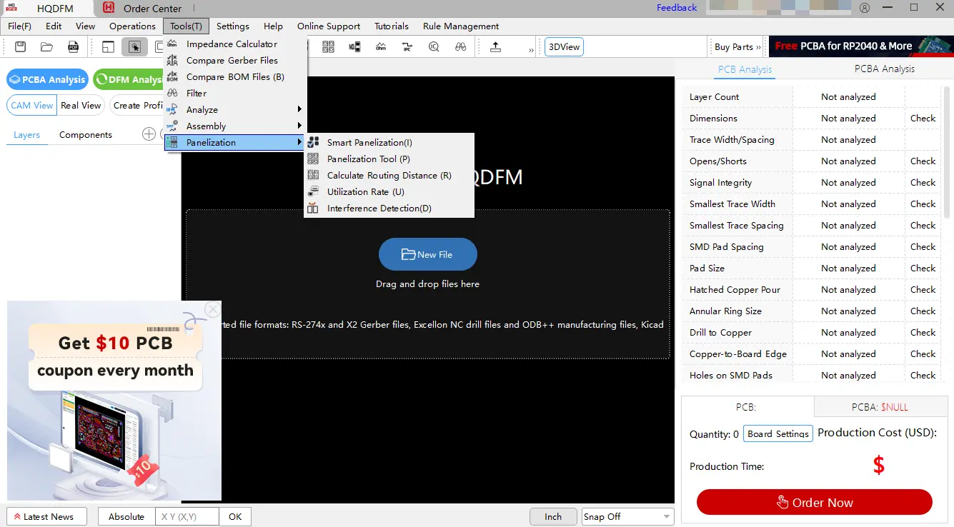 HQDFM is an integrated platform for PCB design and DFM analysis. Beyond impedance calculation, its built-in tool suite covers multiple stages of PCB production verification: